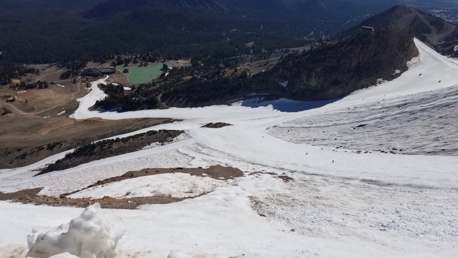 Mammoth’s last day of skiing for this season is Sunday, July 28. Yesterday the skiing was really good first thing in the morning, but was getting pretty soft by 10:30. Plan accordingly and get up early. The picture above is from yesterday (Friday) looking down Cornice Bowl.